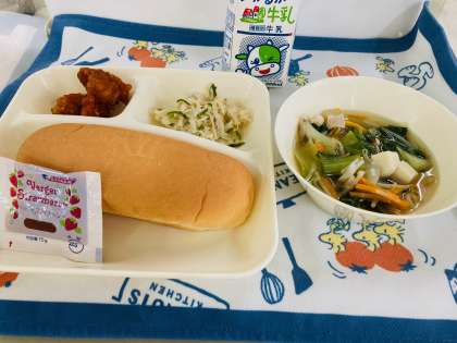 今日の献立は「ヤンニョムチキン、とうふのスープ、切干しだいこんのナムル、コッペパン、いちごジャム、牛乳」でした。