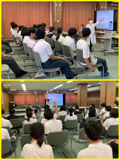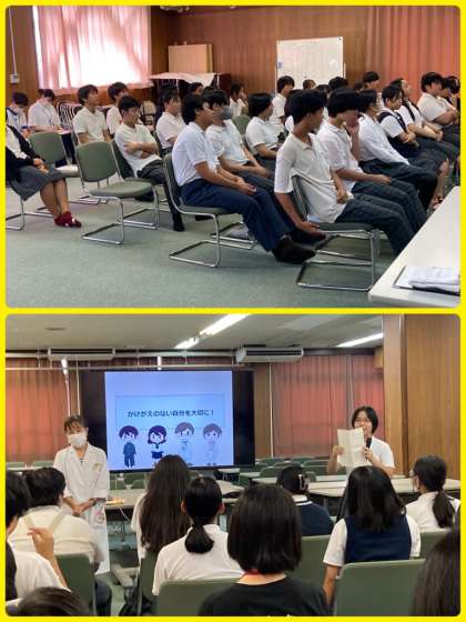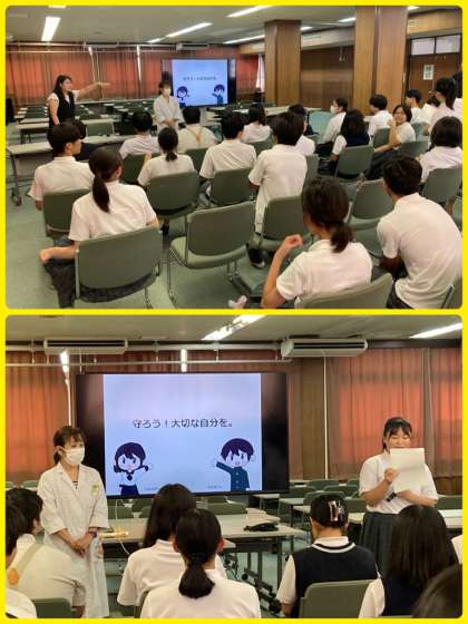 9年生は、学校薬剤師の先生を招いて薬物乱用防止教室を行いました。今後も使用していく可能性がある「薬」の正しい使い方や、身近に起こっている危険な事例などについてお話していただきました。