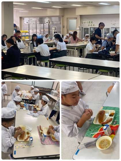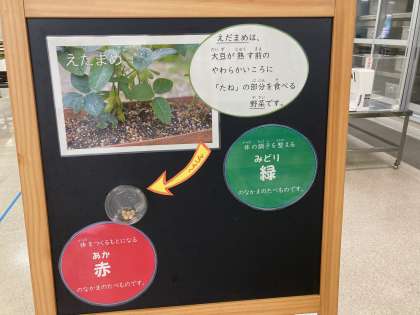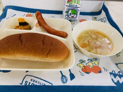 今日の献立は「ウインナーのケチャップソース、スープ、焼きかぼちゃ、黒糖パン、牛乳」でした。えだまめは、大豆が熟す前のやわらかいころに「たね」の部分を食べる野菜です。体の調子を整える緑のなかまのたべものです。