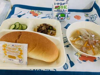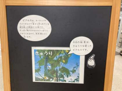 今日の献立は「牛肉のデミグラスソース煮、スープ、きゅうりのピクルス、コッペパン、マーマレード、牛乳」でした。ピクルスは、ヨーロッパやアメリカなどで昔から作られている酢を使った野菜のつけ物です。すっぱい味が、口の中をさっぱりとさせてくれるので、肉料理などに合います。