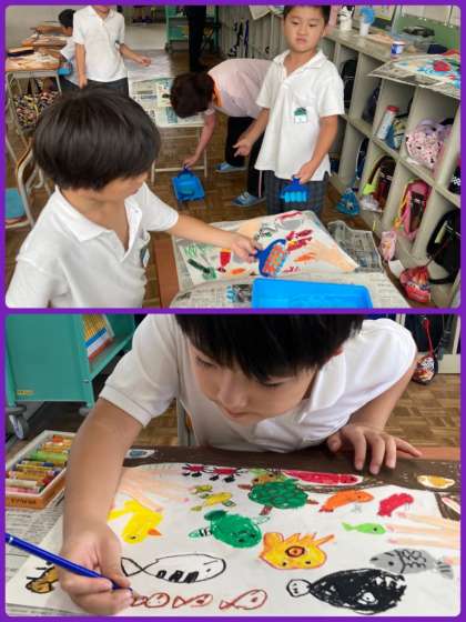 2年生は大和川の水生生物と自分たちがふれ合っている様子を思い浮かべて、絵を描きました。とても楽しそうな様子が絵画からも伝わってきます。
