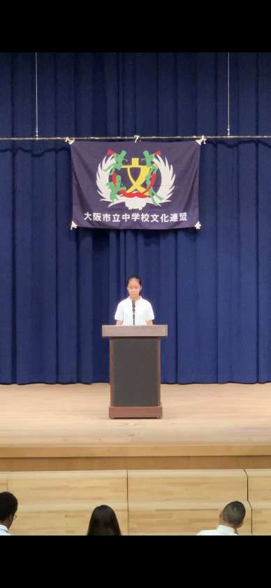9月30日(土)に、大阪市立中学校総合文化祭市長杯英語暗唱の部が本校講堂で開催されました。本校の生徒も出場し、英語暗唱の部でモデルスピーチを務めました。緊張したと話してはいたものの、舞台上では堂々と胸を張って練習の成果をしっかりと発揮することができたようです。これからの英語学習に対する大きな自信になったのではないでしょうか。