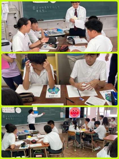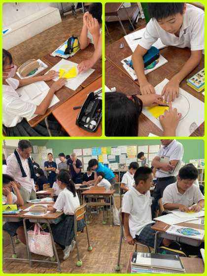 6年生は算数で、円のおよその面積をどのように求めるとよいか考えました。グループワークで、折り紙を利用しながら、できる限り円に近い面積がないか話し合っていきました。今までに習った図形の面積の求め方を利用しながら、見当をつけて、公式に近付けていきました。