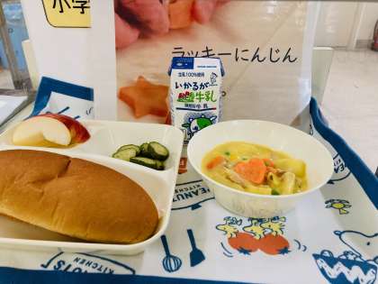 今日の献立は「豆乳コーンクリームシチュー[米粉]、きゅうりのバジル風味サラダ、りんご、黒糖パン、牛乳」でした。りんごは、寒冷地での栽培に適した果物です。日本では明治時代から栽培され、青森県、長野県、岩手県などで多く作られてきました。