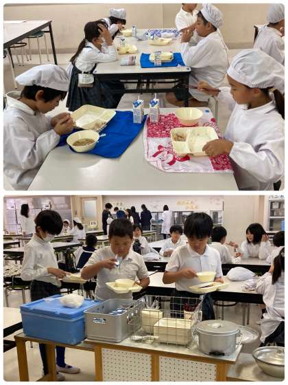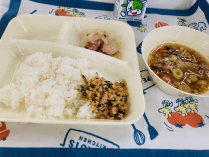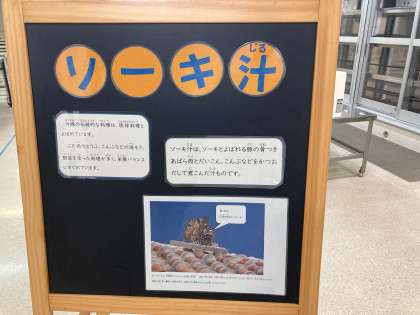 今日の献立は「鶏肉のゆず塩焼き、ソーキ汁、ツナ大豆そぼろ、ごはん、牛乳」でした。ソーキ汁は、豚の骨付きあばら肉をだいこんなどと一緒にやわらかく煮込んだ汁のことです。給食では豚ばら肉を使用しています。