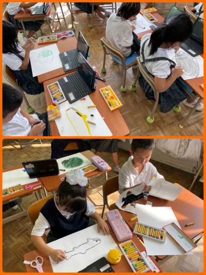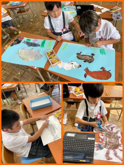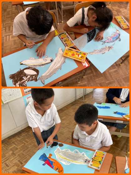 1年生は図工で、大和川の魚の絵を描きました。クレパスを使って、個性あふれるたくさんの水の中の生き物を描きました。クレパスの使い方もどんどん上手になっています。