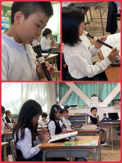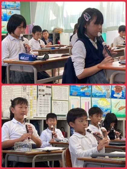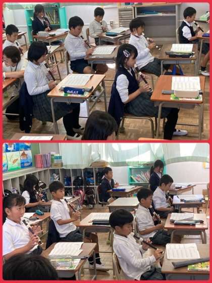 3年生は、リコーダーで「ブラックホール」を吹きました。注意点を音楽担当の先生に教えてもらいながら、アップテンポの激しい曲でも、リズムを合わせて上手に吹いています。今後も、どんどん上達していってほしいです。