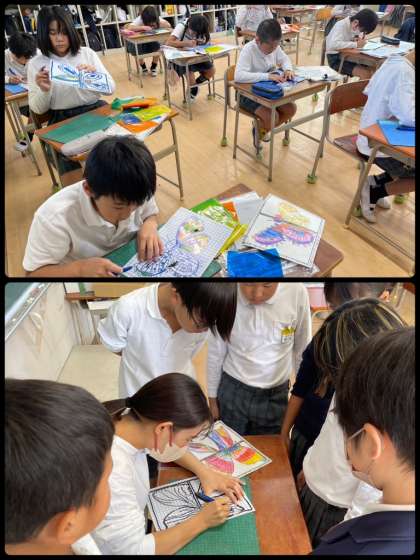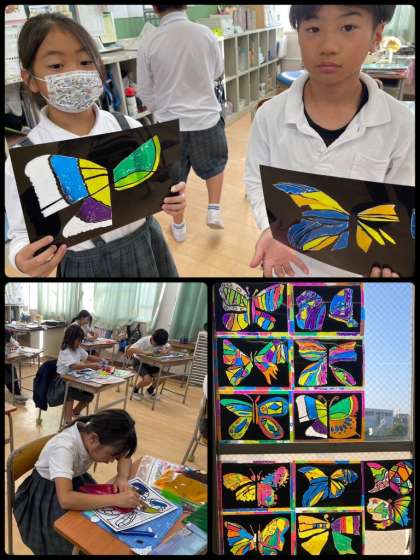 4年生は図工の学習で、ステンドグラス風のチョウを作りました。設計図をもとに、カッターで慎重に切り進めました。窓ガラスに貼ると、カラフルで幻想的に見えます。