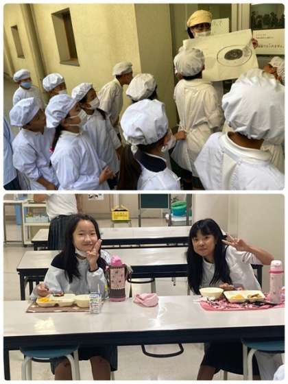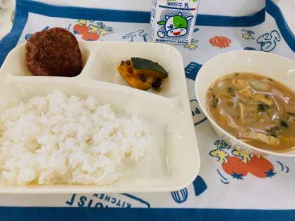 今日の献立は「和風ハンバーグ、みそ汁、かぼちゃのいとこ煮、ごはん、牛乳、中学校:焼きのり」でした。いとこ煮とは、野菜や豆を食べるときに「追い追い(甥、甥)煮る」ことから、甥同士はいとこであるため「いとこ煮」と呼ばれるようになったといわれています。