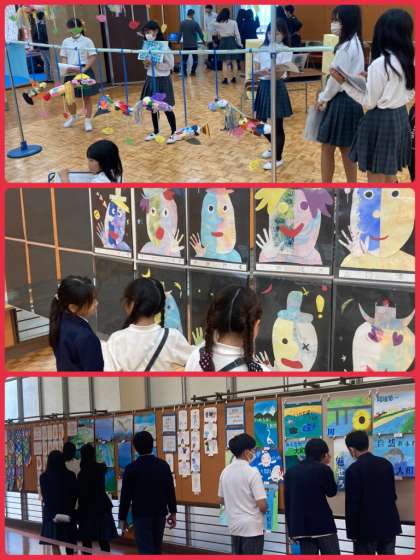 昨日、本日と2日間、作品展を開催しております。児童生徒も、学年ごとにじっくり鑑賞しました。友達や先輩後輩の作品の素晴らしいところをたくさん見つけることができました。