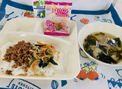 今日の献立は「ビビンバ、わかめスープ、いもけんぴフィッシュ、牛乳」でした。