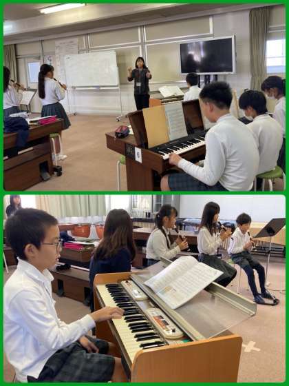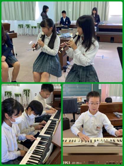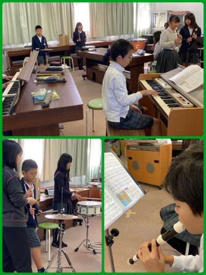 5年生は音楽の授業で、リコーダー・オルガン・シンバル・小太鼓など、各楽器に分かれて合奏の練習をしました。人数の少ない学年ですが、全員で奏でた時はとても迫力があります。これからも、色んな曲の練習にのぞんでいきましょう。