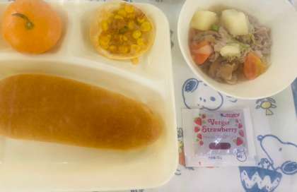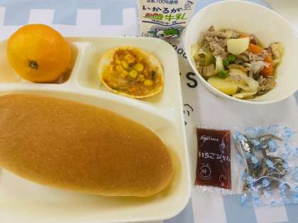 11月13日の献立は「豚肉と野菜のスープ煮、変わりピザ、みかん、中学校:ミニフィッシュ、コッペパン、いちごジャム、牛乳」でした。給食の変わりピザは、ぎょうざの皮に、ツナ、コーン、ピーマン、ピザソース、チーズを混ぜ合わせた具をのせ、焼きもの機で焼いています。