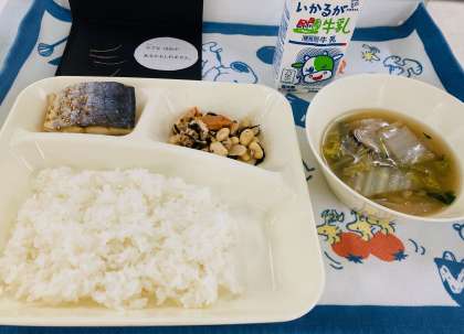 今日の献立は「さごしのごまじょうゆかけ、うすくず汁、大豆の煮もの、ごはん、牛乳」でした。