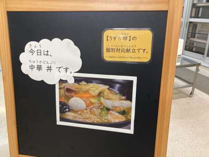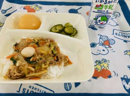 今日の献立は「中華丼、きゅうりのピり辛あえ、白桃(缶)、牛乳」でした。中華丼は、【うずら卵】の個別対応献立です。