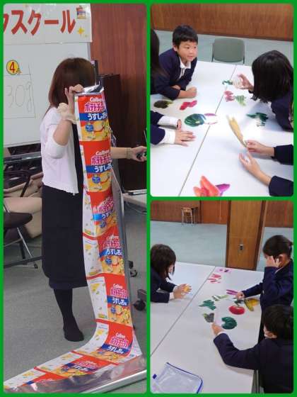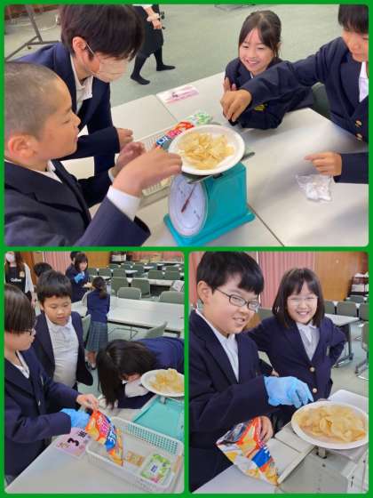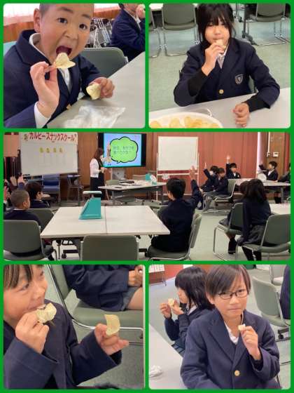 4年生が、カルビースナックスクールにのぞみました。おやつを食べる時の注意点を学び、1日の目安量から、自分が食べている量を見つめ直しました。サッポロポテトには、意外な野菜が入っていることも分かりました。