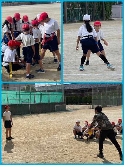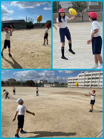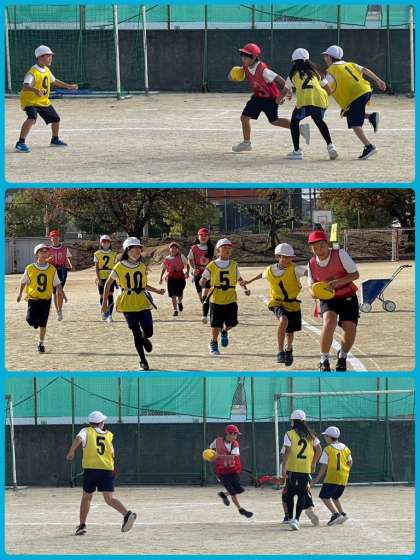 5年生は体育で、タグラグビーをしています。タグをとられないように、パスをうまくつないでいくにはどうすればよいのか、チームで作戦を工夫しながら、練習から試合へとのぞんでいます。