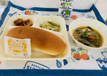 今日の献立は「焼きシューマイ、中華みそスープ、ツナと野菜のオイスターソースいため、コッペパン、マーマレード、牛乳」でした。