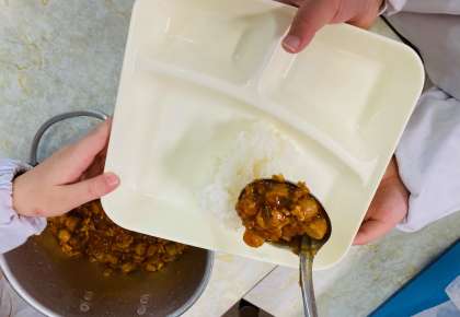 写真上【1年生】ごはんを盛りつけた上に具をかけます。真ん中を少しくぼませて、おたまをくるりと反転させます。受け取る人との息もぴったりです。