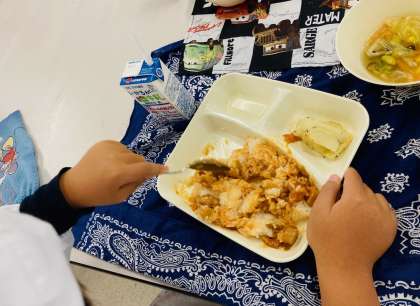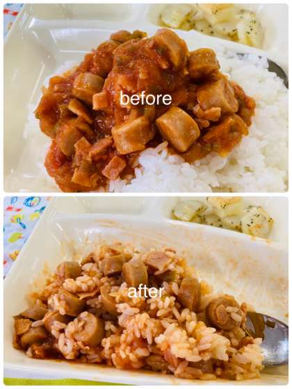 写真中【3年生】スプーンを少し横にしてコツをつかむと、きれいなケチャップライスが完成していました。
