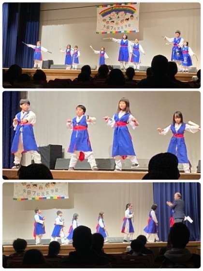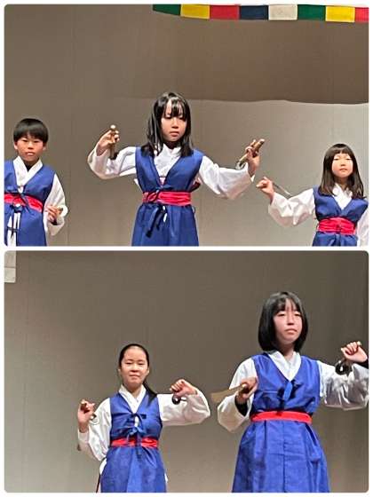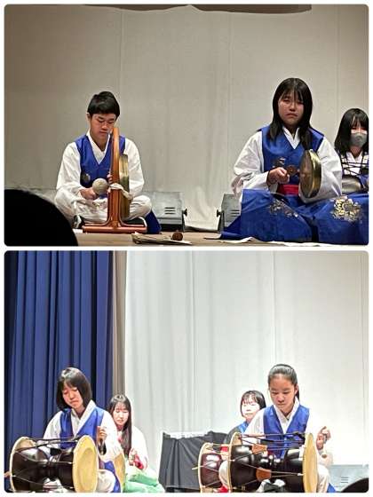 本校の児童生徒は「칼춤(カルチュム)」(剣の舞)を踊りました。両手に剣を持ち、華麗な舞を披露し、会場中から大きな拍手をもらっていました。また、中学生は他の中学校と合同で「사물놀이(サムルノリ)」(民族打楽器演奏)を披露し、息の合った迫力ある演奏で客席の人々を魅了しました。