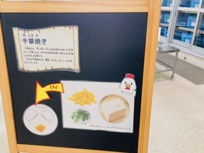 今日の千草焼きには、鶏肉(ささみ油漬け)、とうふ、コーン、みつばが入っていました。