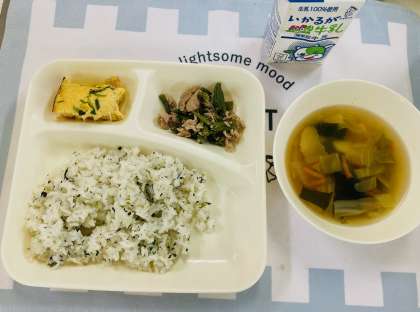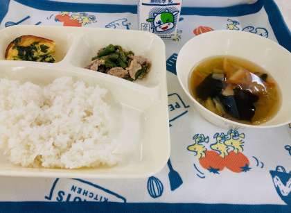 今日の献立は「具だくさん卵の千草焼き、五目汁、豚肉とさんどまめのいためもの、小学校:ごはん、中学校:菜飯、牛乳」でした。千草焼きは、卵に細かく刻んだ具を混ぜて焼いた料理です。「千草」とは、さまざまな材料を取り合わせた料理につけられる言葉です。
