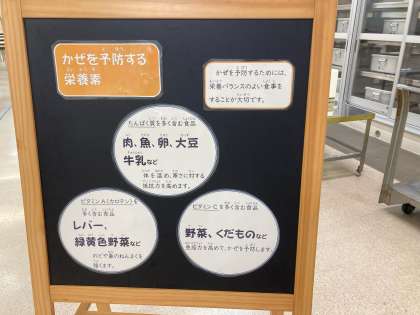 かぜを予防するには、栄養バランスのよい食事で免疫力を高めておくことが大切です。たんぱく質を多く含む食品(魚・肉・卵・豆・豆製品・牛乳・乳製品など)は、体を温めて、寒さに負けない体にします。ビタミンA(カロテン)を多く含む食品(緑黄色野菜など)は、のどや鼻などのねんまくを強くします。ビタミンCを多く含む食品(野菜・くだものなど)は、ウイルスから体を守り、病気を予防します。