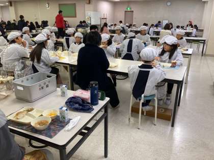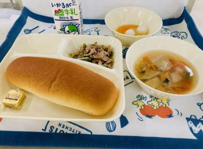 今日の献立は「豚肉と野菜のソテー、はくさいのスープ、フルーツ白玉、コッペパン、バター、牛乳」でした。