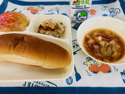 今日の献立は「きのこのドリア、トマトスープ、りんご、黒糖パン、牛乳」でした。エリンギはヨーロッパ原産のきのこです。日本では約30年前から栽培されるようになりました。コリコリとした食感があわびに似ていることから「白あわびたけ」と呼ばれることもあります。