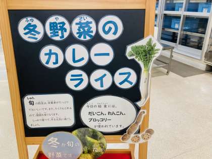 今日の献立は「冬野菜のカレーライス、ブロッコリーとコーンのサラダ、黄桃(カット缶)、牛乳」でした。冬が旬の野菜には、ほうれんそう、だいこん、かぶ、ブロッコリー、はくさい、こまつな、れんこん、きくな、ねぎなどがあります。