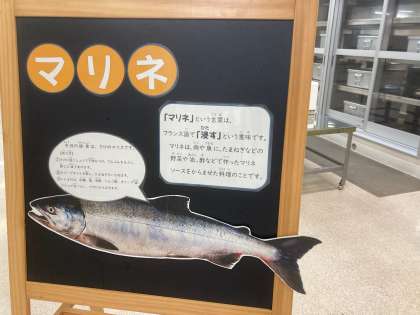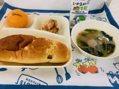 今日の献立は「さけのマリネ、肉だんごと麦のスープ、みかん、おさつパン、牛乳」でした。【マリネ】という言葉はフランス語で【浸す】という意味です。マリネは、肉や魚にたまねぎなどの野菜や油、酢などで作ったマリネソースをからませた料理のことです。