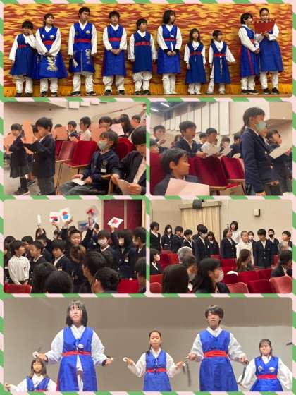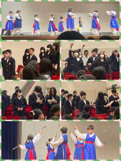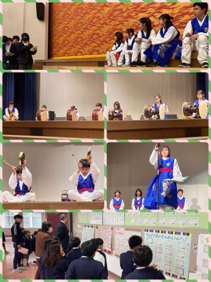 本日、チョソン友の会の発表会がありました。毎週水曜日に学んでいることを全校児童生徒の前で発表してくれました。カルチュム(剣の舞)では、矢田西小学校の児童と合同で立派な演技を披露してくれました。サムルノリ(民族打楽器演奏)では、4種類の楽器を使い、息の合った演奏を見せてくれました。