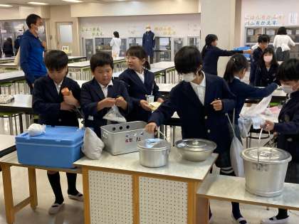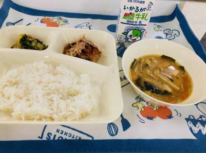 今日の献立は「豚肉のねぎじょうゆ焼き、みそ汁、きくなとはくさいのごまあえ、ごはん、牛乳」でした。