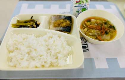 12/15(金)の献立は「さばのみぞれがけ、すまし汁、こまつなの煮びたし、ごはん、牛乳」でした。