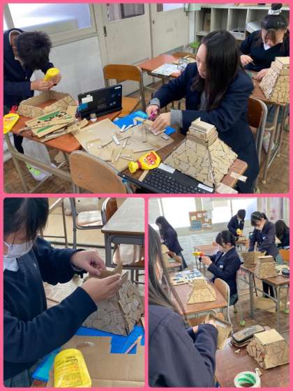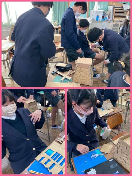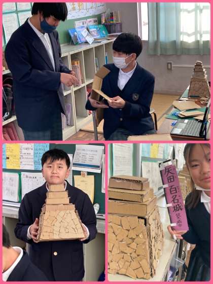 6年生は図工で、段ボールを使って城を作りました。石段から天守閣まで、段ボールを様々な形に切り、ボンドで貼り付けていきました。完成した子に何城か聞いてみると、「姫路城」「名古屋城」「松本城」と、いろいろな答えが返ってきました。