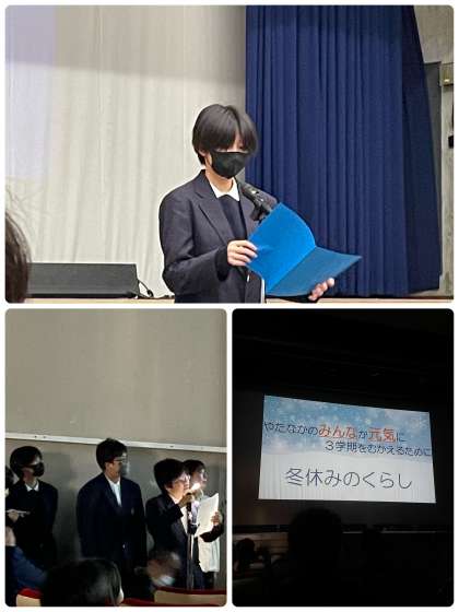 式では、2年生代表の2人が、2学期にがんばったことなどを堂々と話してくれました。また生徒会は、冬休みのくらしについてスライドを流しながら話してくれ、クイズも交えて盛り上げてくれました。みんなが楽しみながらも、安全に冬休みを過ごす意識を高めることができました。