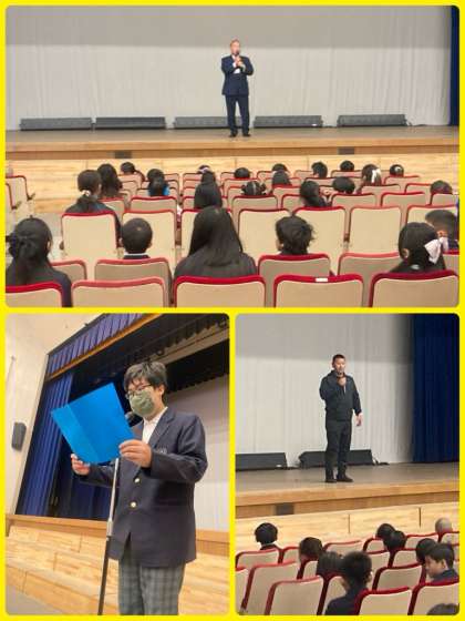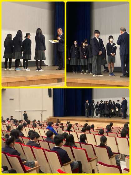3学期が始まりました。まず吹奏楽部の冬休みのコンクールの表彰式があり、表彰状をしっかりと受け取りました。その後、校長先生から能登半島地震の話がありました。それぞれ現実を知り、日々の備えの重要性を理解するとともに、今自分たちができることを考えました。3年生の代表と、生徒会代表は、2学期にがんばったことと新年の決意を伝えてくれました。