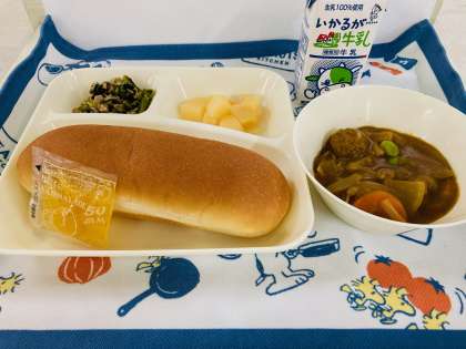 今日の献立は「ミートボールと野菜のカレー煮、ツナとこまつなのソテー、白桃(カット缶)、コッペパン、マーマレード、牛乳」でした。
