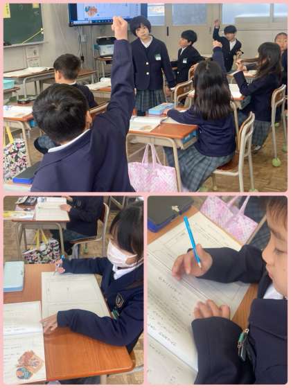 2年生は国語で「かさこじぞう」の学習をしています。この日は、物語の始まりと終わりを比べ、変わったものと変わらなかったものを考えていきました。グループで意見も出し合いながら、じいさまとばあさまが、どんな人物なのかを考えて想像することができました。