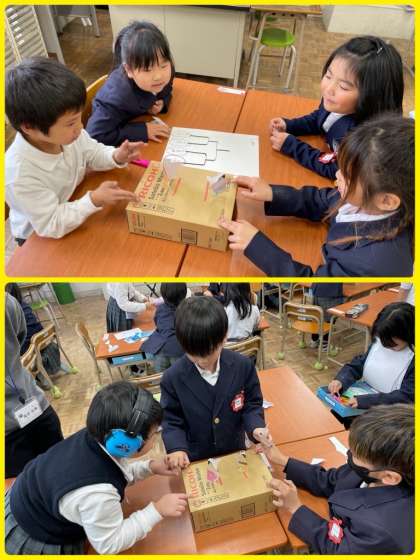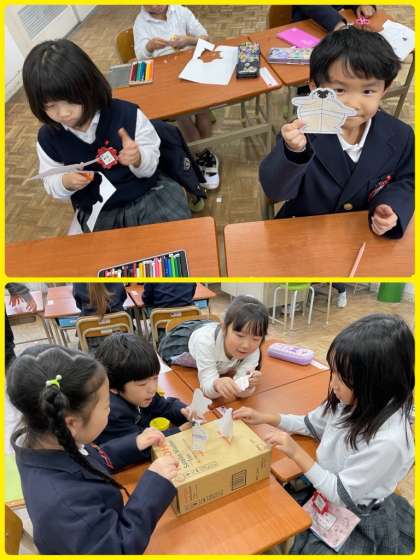 1年生は生活科で、手作り紙ずもうを作りました。色ぬりもして、上手に作っています。そして、クラスでトーナメント戦を行いました。コツをつかみながら試合を重ねていきました。見事に優勝した子には、みんなで大きな拍手を送りました。