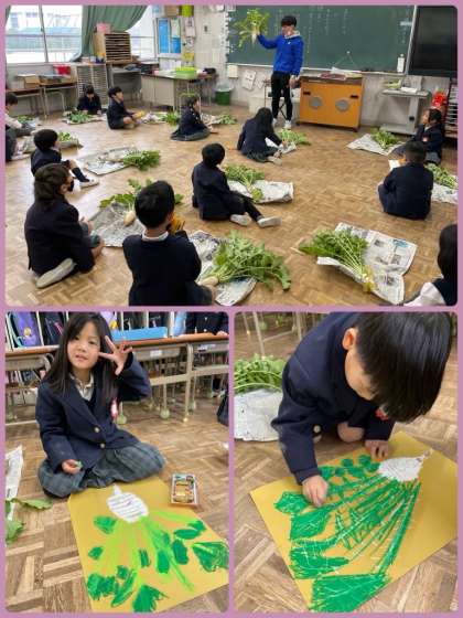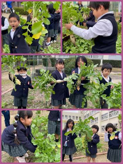 秋に種まきをした田辺大根の収穫の様子です。大きく育つのを楽しみにしていた子どもたち、そんな思いも通じてか大きくりっぱに育ちました。収穫のお祝いに、とれたての大根煮をみんなでいただきました。とてもおいしかったようです。