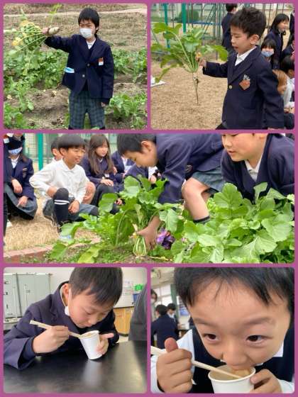 3年生は、収穫の仕方を教えてもらったあと、自分が選んだ田辺大根をぬきました。3年生の中には、毎日のように学習園に来て、成長の様子を確かめたり草引きをしたり、葉っぱが虫に食べられていないかチェックしていた子もいました。万感の思いを込めて、収穫祭にのぞんでいました。