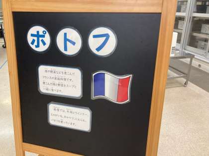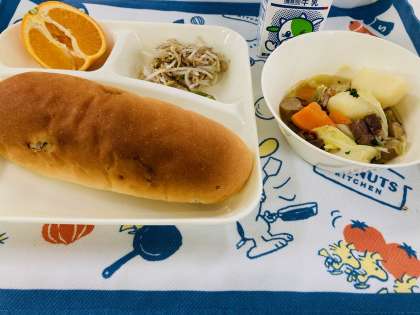 今日の献立は「ポトフ、ツナと野菜のソテー、いよかん、レーズンパン、牛乳」でした。フランスの家庭料理のひとつで、肉や野菜などを煮こんだスープのことを「ポトフ(Pot au feu)」と言います。煮こんだ肉と野菜をスープと一緒に食べます。