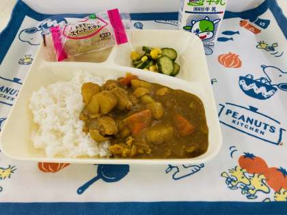 今日の献立は「チキンレバーカレーライス、きゅうりとコーンのサラダ、スイートポテト、牛乳」でした。
