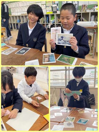 4年生は図工で、アートカードを使ってマッチングゲームをしました。共通点を説明することができればカードをもらうことができるというルールを設定し、多様な考え方で説明できました。また、「罰」の作品を見て気付いたことを付箋に書き、互いの感じ方の共通点や差異に気付くことができました。