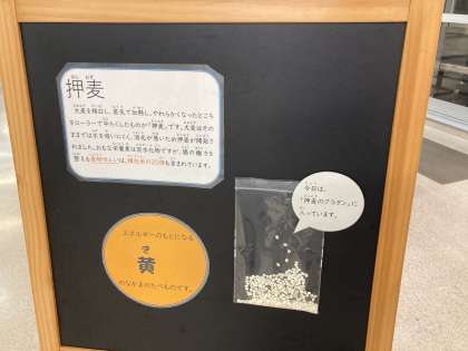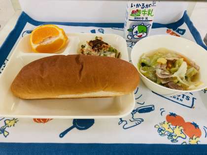 今日の献立は「押麦のグラタン、豚肉と野菜のスープ、デコポン、黒糖パン、牛乳」でした。大麦を精白し、蒸気で加熱して、やわらかくなったところをローラーで平たくしたものを「押麦」といいます。