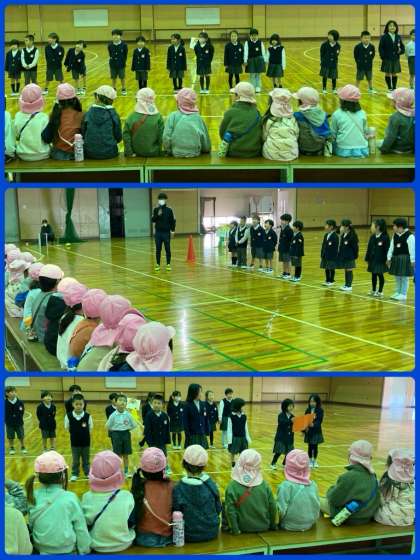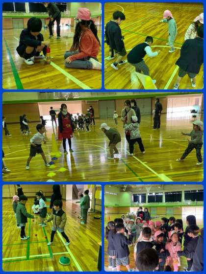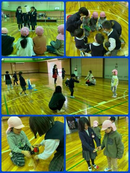 1年生が、近くの保育所の子どもたちを招いて、交流遊びをしました。新1年生は、羽子板・お手玉・けん玉・だるま落とし・めんこの5つのコーナーを順番に回っていきました。1年生は、お兄さんお姉さんらしく優しく遊び方を教えてあげ、お互いに楽しそうに交流していました。