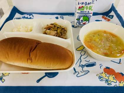 今日の献立は「豚肉のカレー風味焼き、コーンとはくさいのスープ、カリフラワーのレモンドレッシング、黒糖パン、牛乳」でした。