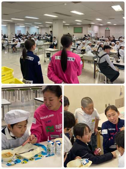 【写真:下】セレッソ大阪のヤンマーレディースの方々と、ランチルームで給食交流をしました。各学年からの質問にも答えていただき、楽しく交流できました。
